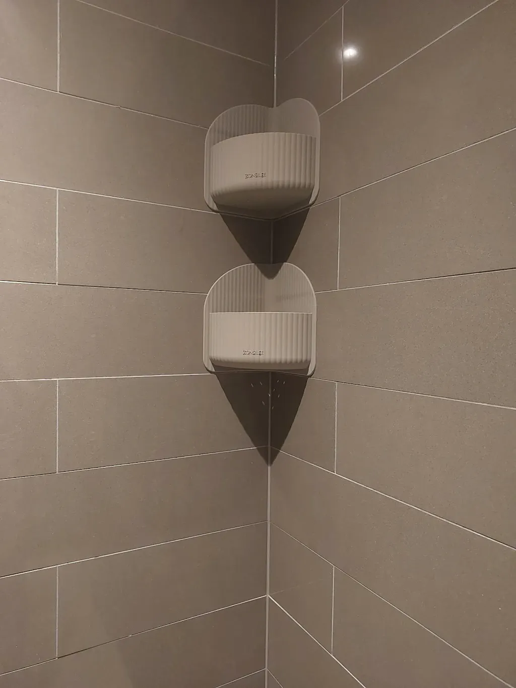 Yes. The Kora Corner Caddy is intentionally designed with no adhesive in the centre corner section, allowing it to sit neatly over the grout line. This also allows water to flow behind the caddy, helping prevent water from pooling.